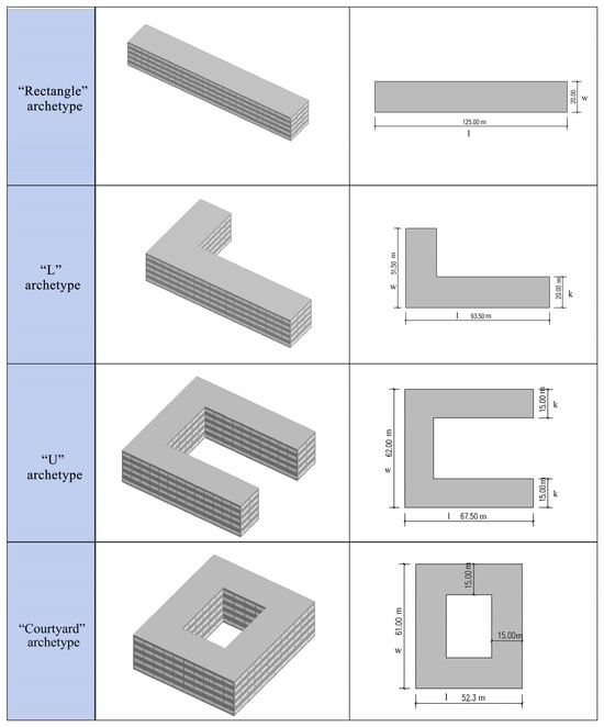 Furthermore, four basic architectural shapes (archetypes) for these buildings were identified as follows: “Rectangle”, “L”, “U”, and “Courtyard”. It was observed that the “Rectangle” and “L” building archetypes commonly have a layout of a “central single corridor with classrooms on both sides,” and the “U” and “Courtyard” archetypes often adopt a “single corridor with classrooms” format. To ensure that all four shapes maintain a floor area of 2500 m