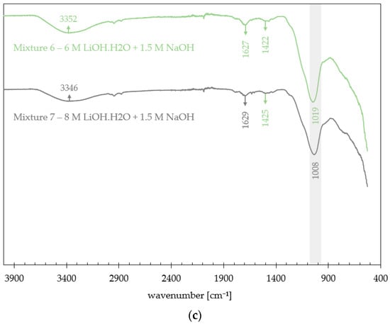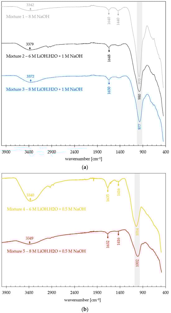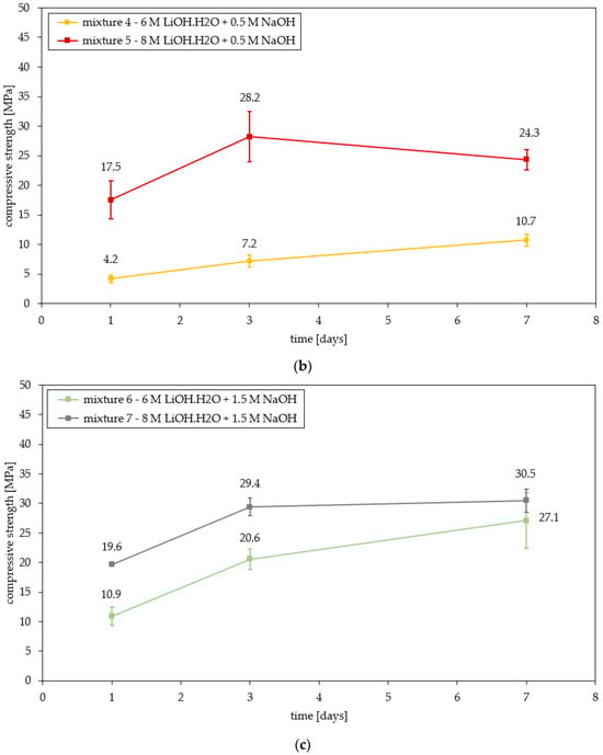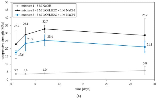 - The most optimal geopolymer mixture from this research was prepared with 8 M LiOH·H2O + 1.5 M NaOH and 11.6 wt% Na2SiO3 and showed a 7 d compressive strength of 30 ± 2 MPa.