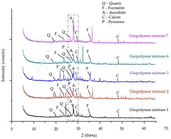 - The FTIR spectra confirm successful geopolymerization based on the peaks at 970–1220 cm−1, which are related to Si-O-Si stretching vibrations. This indicates the formation of silicate tetrahedral structures, which are crucial for the formation of the geopolymer network.