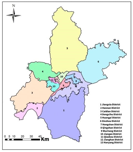 Wuhan is situated in the eastern part of the Jianghan Plain, at the heart of the Yangtze River Basin []. It stretches approximately 134 km from east to west and about 155 km from north to south, covering an area of 8569.15 square kilometers. With a permanent population of 13.649 million, it consists of 13 administrative districts. Serving as a vital strategic hub in the rise of central China, Wuhan’s administrative divisions are depicted in Figure 1. The Yangtze River flows 145 km within the boundaries of Wuhan, with 60 km flowing through the urban area. The width of the Yangtze river surface ranges from 1000 m to 1200 m, reaching up to 3400 m at its widest point. During periods of abundant rainfall and extreme heavy rain, the water level of the Yangtze River can rise to 27–28 m. Historically, the peak water level of the Yangtze River in the Wuhan section reached 29.73 m in 1954 and 29.43 m in 1998. Within the boundaries of Wuhan, the Yangtze River is joined by tributaries such as Dongjing River, Han River, Fu River, She River, Dao River, and Ju River to the north, and larger tributaries such as Jinshui River, Xunsi River, and Qingshan Port to the south. The Han River and Fu River converge with the Yangtze River within the main urban area of Wuhan. Wuhan city boasts abundant lake resources and is known as the “City of a Hundred Lakes”. According to statistics from the Wuhan Lake Bureau, there are a total of 166 lakes within the city’s boundaries, with a total water area of 5925.2 square kilometers and a total water surface area of 779 square kilometers under normal water levels. Among them, 40 lakes are distributed within the main urban area of Wuhan.