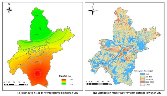 (1) Hazard of Causative Factors []. The main causative factor for urban flood disasters is typically heavy rainfall, especially under extreme conditions. Therefore, we use annual average precipitation and distance to water bodies as evaluation indicators to study the Hazard of Causative Factors. Using the spatial analysis module in ArcGIS, we downloaded monthly precipitation data for each district in Wuhan from the Chinese Academy of Sciences Data Center for the years 2000 to 2020. We filtered and summarized the data in Excel2021 to calculate the total precipitation for each year by summing the monthly values. We divided the total precipitation by the number of years to obtain the annual average precipitation for each district in Wuhan. We saved this vector data and imported it into ArcGIS to join it with the administrative boundaries of Wuhan’s districts. We applied kriging interpolation analysis to generate raster data of the annual average precipitation for Wuhan. We downloaded hydrological data for Wuhan from the National Geographical Information Resource Catalog Service System. We imported the data into ArcGIS for Euclidean distance analysis. We established multi-level buffer zones based on the distance from lakes and rivers, categorized into five intervals: <200 m, 200 m~500 m, 500 m~1000 m, 1000 m~3000 m, >3000 m, as shown in Figure 2.