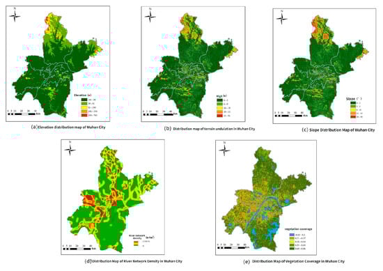 The flood hazard reflects the sensitivity of the study area to high-intensity rainfall events, considering factors such as topography, vegetation, and river networks. In this study, the sensitivity of Wuhan City to flooding was assessed based on the analysis of elevation, terrain undulation, slope gradient, river network density, and vegetation coverage, as shown in Figure 11.