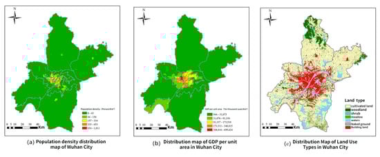 (3) Vulnerability of Exposed Bodies. Based on human safety and socio-economic factors, if an area has a larger population and more developed economy, the damage caused by flood disasters will be greater []. Typically, the vulnerability level of flood disasters is used to describe the severity of this situation. In this paper, the indicators selected for vulnerability assessment are population density, GDP per unit area, and land use types. We selected the data for these indicators with their corresponding units, and performed masking extraction to obtain Figure 4.