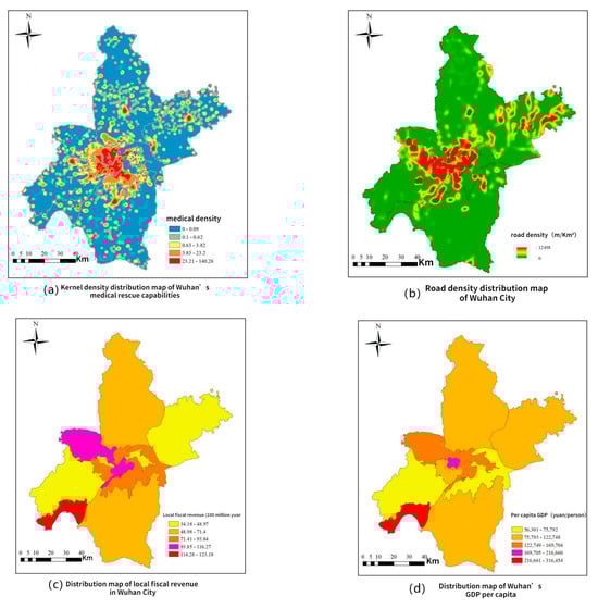 (4) Disaster Prevention and Mitigation Capability. This refers to humanity’s defense and resistance capabilities in the face of flood disasters. The societal capacity to withstand disasters can reduce the losses caused by disasters []. The stronger the capacity, the lower the losses. This paper selects medical rescue capability, road density, and financial support capability to reflect the region’s Disaster Prevention and Mitigation Capabilities. We selected the 2020 national point of interest (POI) data and extracted medical service data. We imported and clipped it to obtain relevant medical points of interest in Wuhan City. We utilized the kernel density analysis tool in spatial analysis, employing geometric intervals to classify it into five categories. We downloaded national road data from the OpenStreetMap website, imported it, and clipped it to obtain road data for Wuhan City. We used the raster calculator to assign zero values to any null values. We converted the raster data to points and performed kriging interpolation to obtain road density data for Wuhan City. We downloaded vector data for regional GDP and local fiscal revenue. We calculated per capita GDP by dividing the regional GDP by the population for each region. We imported the data into ArcGIS and rasterized it based on county administrative units. We utilized the standard deviation method for classification to obtain distribution maps for local fiscal revenue and per capita GDP, as shown in Figure 5.