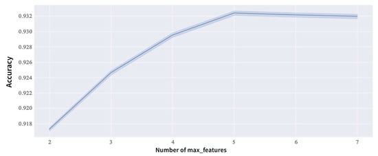 Parameter adjustment is continuously verified, and it is found that when n_estimators = 118 and max_features = 5, the accuracy is 0.93706. As shown in Figure 6 and Figure 7, the cross-validation set is repeatedly modified until the highest accuracy of 0.94418 is obtained.