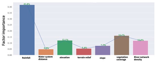 In the hazard indicator of flood risk, the proportion of annual average rainfall is the highest, indicating the highest importance level, reaching 41.8%. Following that are vegetation coverage, elevation, and river network density, accounting for 16.1%, 12.1%, and 12.0%, respectively. They also show strong correlations. In comparison, slope, terrain undulation, and distance to water bodies have the lowest importance levels in the impact of urban flood disasters, at 7.7%, 5.4%, and 4.9%, respectively, indicating a relatively minor impact on disasters, as shown in Figure 8.