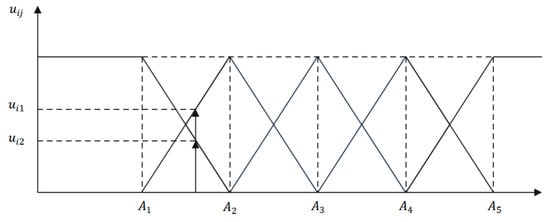 The membership function essentially reflects the objective research object, and the degree of membership, as the foundation, can describe the fuzziness of factors []. Through the membership function, fuzzy evaluation methods can be applied to solve practical problems [,]. In this paper, fuzzy distribution combination is mainly used to construct the membership function to evaluate flood risk in Wuhan City. The construction method is as follows: first, the evaluation indicator data is divided into different levels, and the most commonly used ascending and descending trapezoidal functions and triangular functions are selected. The descending trapezoidal function is used for the low-value area, while the ascending trapezoidal function is used for the high-value part. The middle value part is represented by a triangular function. This construction of membership functions is more in line with actual situations, as shown in Figure 9.