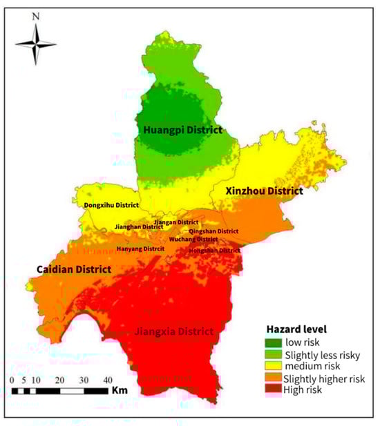 From the figure, it can be observed that the central and southern regions of Wuhan have higher hazard severity, while areas of lower severity are mainly distributed in the northern low hills. There is a gradient increase in hazard severity from north to south. Specifically, large portions of Jiangxia District exhibit high hazard severity, as well as some areas in Hongshan District, Hannan District, and Caidian District. These areas have numerous water systems and lakes, and they typically experience abundant rainfall throughout the year. Similarly, central urban districts such as Wuchang, Hankou, Jianghan, Jiang’an, and Qiaokou also demonstrate relatively high hazard severity due to their high level of urbanization. The Huangpi District has the lowest hazard severity.