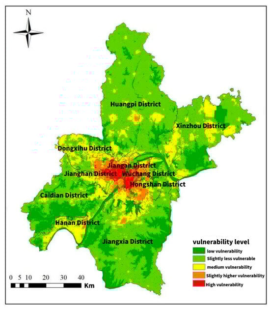 Distribution of vulnerability levels of flood hazards in Wuhan City.