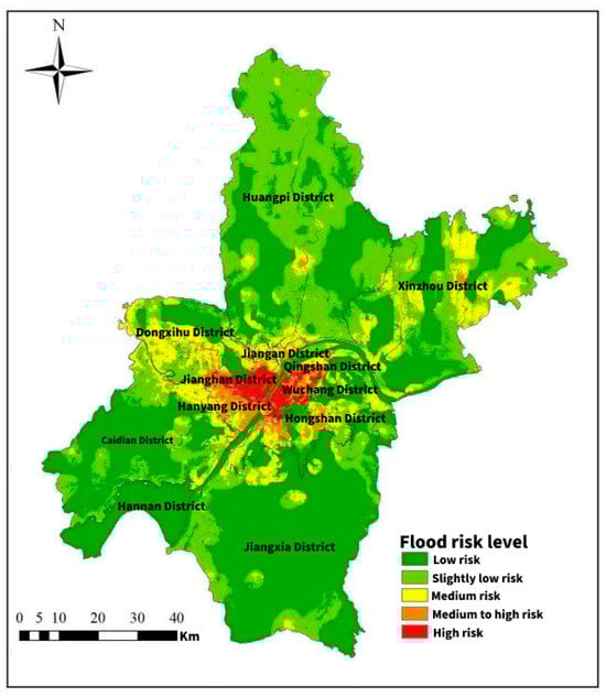 Comprehensive risk level distribution map of flood disasters in Wuhan.