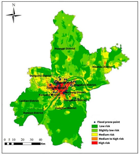 Analysis of the results from the graph reveals that the distribution of vulnerable points aligns closely with the final distribution of disaster risk depicted in the map. Vulnerable points are predominantly concentrated in the central urban areas, such as around the Jianghan District, Qiaokou District, Jiang’an District, and Wuchang District. By comparing the inundation-prone points within Wuhan with the final results of disaster risk distribution, although the sample size for disaster validation is limited, it can be concluded that the flood risk assessment results obtained in this study are generally consistent with historical disaster situations, indicating a relatively high level of accuracy.