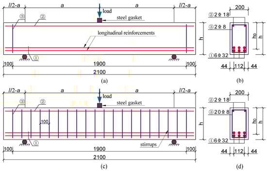 Dimensions and layouts of the tested beams (unit: mm). (a) Non–stirrup UHPC beams; (b) side elevation of (a); (c) stirrup–reinforced NC beams; and (d) side elevation of (c). Note: ① 6C32 indicates six HRB400 ribbed reinforcements with a 32 mm diameter, ② 2C18 indicates two HRB400 ribbed reinforcements with an 18 mm diameter, ③ 2C8 indicates two HRB400 8 mm diameter double–leg stirrups, and ③ 20C8 indicates twenty HRB400 8 mm diameter double–leg stirrups.