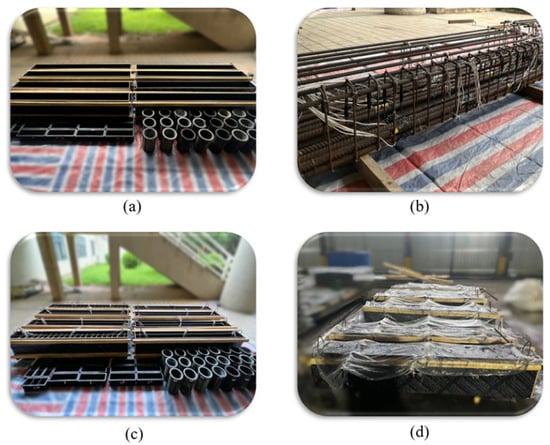 Construction of the specimens. (a) Formwork fabricating; (b) steel bar tying; (c) reinforcement cages laying; (d) tested beam casting.