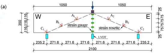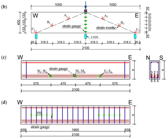 To improve efficiency, three-point loading tests were performed on each specimen to evaluate the shear behavior of the non-stirrup UHPC beams, as shown in Figure 3. The specimens were subjected to a vertical concentrated load using an electro-hydraulic servo machine with a capacity of 10,000 kN. Each specimen was supported by two roller supports. Three linear vertical displacement transducers (LVDTs) were employed to monitor the deflections of the tested beams, which were positioned at the midspan of each beam and the locations of the roller supports, respectively. Figure 4 shows six groups of strain rosettes labelled A1 to C1 and A2 to C2, evenly distributed along the line extending from the loading point to the supports. Each strain rosette comprised three strain gauges, set at angles of 0°, 45°, and 90°, which were utilized to measure the principal strains. The longitudinal reinforcement strain and stirrup strain were quantified by the strain gauges affixed to the rebars. To ensure accurate measurements, the rebars were sanded smooth at the gauge location before applying the strain gauges. Furthermore, waterproof adhesive and anti-collision blocks were used to protect the strain gauges. The longitudinal reinforcements were labelled 1–3 and 4–6 from the south side to the north side of the double layer reinforcements, respectively, as shown in Figure 4c. The letters “N” and “S” indicate north and south, respectively. The strain gauges attached to the longitudinal reinforcements were labelled W1–W6, M1–M6, and E1–E6 from the west side to the east side. The letters “W”, “M”, and “E” indicate west, middle, and east, respectively. All data were collected using the JMTEST static collector including load force, beam deflection, longitudinal reinforcement strain, stirrup strain, and concrete strain. The detail of the layout of the strains and LVDTs can be seen in Figure 4.