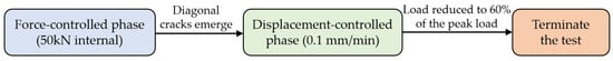 The loading protocol comprised two phases: the force-controlled phase and displacement-controlled phase. Before the shear diagonal cracks emerged, the loading was force controlled with an internal force of 50 kN. After that, the displacement-controlled phase was carried out at a loading rate of 0.1 mm/min. When the load was reduced to 60% of the peak load, the test was terminated. The schematic representation of the loading protocol is shown in Figure 5.