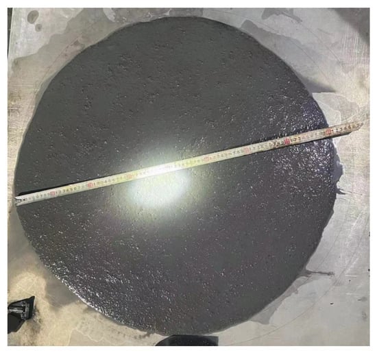 The UHPC used in this study was provided by Zhonglu Dura International Engineering Co., Ltd. in Zhaoqing China, and was the same as the mixture used by Feng et al. []. The relevant equipment was source from China. A flow test was conducted and the slump flow diameter was 80 mm, as presented in Figure 6. The mechanical properties of the UHPC were subjected to rigorous testing including cubic compressive strength, axial compressive strength, splitting tensile strength, and flexural tensile strength.