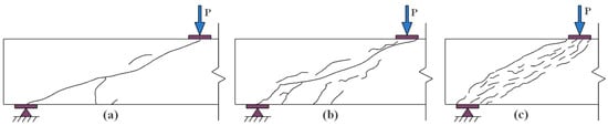 Types of shear failure. (a) Diagonal tension failure; (b) shear compression failure; (c) diagonal compression failure.
