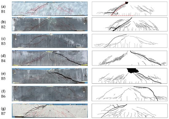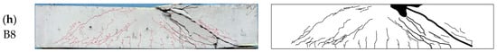 Crack pattern of each tested beam. (a) B1; (b) B2; (c) B3; (d) B4; (e) B5; (f) B6; (g) B7; and (h) B8.