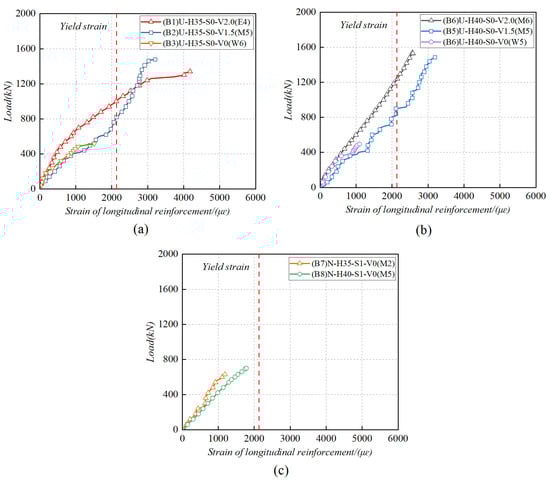 Load–strain curves of longitudinal reinforcements. (a) U-H35-S0-V* beams; (b) U-H40-S0-V* beams; (c) N-H*-S1-V0 beams.