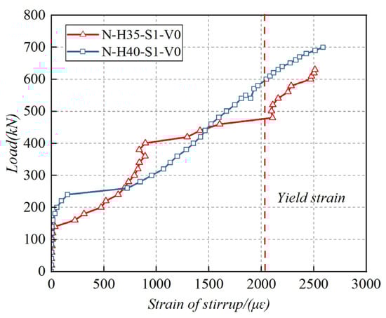 The load–strain relationships of the stirrups for beams N-H35-S1-V0 (B7) and N-H40-S1-V0 (B8) are presented in Figure 11. The yield strength and elastic modulus of the stirrup were assumed to be 412 MPa and 2.0 × 105 MPa, respectively. Consequently, the yield strain of the longitudinal reinforcements was approximately 2060 µε, which was also marked with a vertical dashed line. As can be observed, the strain of the stirrups in B7 and B8 increased slightly with the increase in load before the diagonal cracks emerged. Upon the emergence of diagonal cracks in the shear-bending section, the strain of the stirrups exhibited a turning point. As the load improved, the strain of the stirrups gradually increased, and finally exceeded the yield strain. The experimental results presented in Figure 11 indicate that the stirrups experienced minimal stress prior to the onset of the diagonal cracks. After the diagonal cracks traversed the shear-bending section, the tensile strength of the concrete in the section was significantly reduced, resulting in the transfer of tensile stress to the stirrups. This is evidenced by the surge in the strain of the stirrups upon the appearance of the diagonal cracks. Furthermore, it is evident that the stirrups in both B7 and B8 yielded before the beams reached their ultimate loads. This suggests that the stirrups were fully utilized in resisting the shear force.