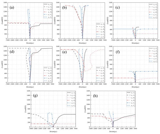 The principal tensile strains and principal compression strain were calculated using Equation (1), where , , and , and are the strains of strain gauges set at angles of , , and , respectively. The positive calculation results indicate the principal tensile strain, while the negative results indicate the principal compressive strain.