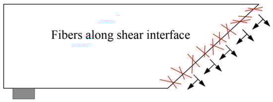 The bridging action of steel fibers plays a crucial role in determining the post-cracking behavior of UHPC. It inhibits the development of microcracks in the UHPC matrix and withstands tensile stresses, especially after concrete cracking. The schematic of bridging action is depicted in Figure 13. As illustrated in Figure 8a–f, the steel fiber volume content has a significant impact on the failure modes of UHPC beams. For example, by comparing specimens B1, B2, and B3 as well as B4, B5, and B6 with the same beam height, respectively, it can be identified that the lack of the bridging action of steel fibers resulted in specimens B3 and B6 quickly losing their load-bearing capacity and suddenly failing. However, in comparison with B3 and B6, the steel fiber-reinforced specimens B1, B2, B4, and B5 demonstrated excellent ductility. The test results confirmed the role of steel fibers in improving the shear resistance of non-stirrup UHPC beams. This finding is in accordance with the experimental results of Li et al. [], although the ductility coefficients of the UHPC beams in this study were lower than those of the aforementioned study. This discrepancy may be attributed to the differing shear span-to-effective depth and reinforcement ratio between this study and that of Li et al. [].