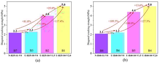 Table 4 shows a positive correlation between the volume content of steel fiber and diagonal cracking strength. In the U-H35-S0-V1.5(2.0) and U-H40-S0-V1.5(2.0) beams, the diagonal cracking strength could be increased by up to 81.8%, 127.3%, 109.5%, and 138.1%, respectively, in comparison to the N-H35-S1-V0 and N-H40-S1-V0 beams. In comparison to the U-H35-S1-V0 and U-H40-S1-V0 beams, the incorporation of steel fibers demonstrated a notable enhancement in diagonal cracking strength, with an increase of 73.9%, 117.4%, 100.0%, and 127.3%, respectively. In the U-H35-S0-V2.0 and U-H40-S0-V2.0 beams, the diagonal cracking strength was increased by up to 25.0% and 13.6%, respectively, compared to the U-H35-S0-V1.5 and U-H40-S0-V1.5 beams. The details of the effect of steel fibers on the diagonal cracking strength are shown in Figure 14. From the results, it can be inferred that the incorporation of steel fibers is conducive to delaying diagonal cracking and that an increase in the volume content of steel fiber within a certain range is beneficial for enhancing the beams’ diagonal cracking strength.