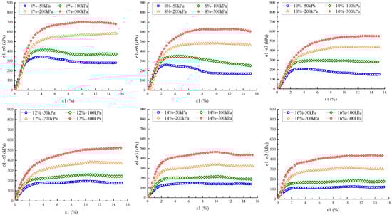 Meanwhile, the figure illustrates that some of the specimens of soil show brittle damage when the moisture content is small (<12%), while the soil samples basically show plastic damage when there is a lot of moisture present (≥12%). When the moisture content is less than 12%, clayey sand under low confining pressure (50–100 kPa) shows a pattern of stress softening. As the pressure to confine increases, the specimens of soil are transformed from stress softening to stress hardening, and the soil specimens’ maximum shear strength appears at larger axial strains. When the moisture content is 12 percent or higher, the clayey sand specimens with different confining pressures all show a trend of stress hardening. From a microscopic perspective, the microstructure of the soil changes under high confining pressure, which results in increased intergranular embedding and a denser arrangement of soil particles. At the macro level, it was shown that the soil specimen’s shear strength has a higher and stronger resistance to external deformation [,]. Whereas, when the confining pressure was identical, the rise in the amount of moisture makes the skeleton of the soil soften, and its shear strength decreases while showing stress hardening [].
