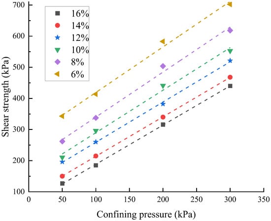 Figure 3 shows the test curves for the unsaturated clayey sandy soil’s peak shear strength at various water contents. The difference in primary stress at 15% of the axial strain is used to determine the peak strength when the specimen lacks a discernible peak. Evidently, the strength of shear and confining pressure under each amount of moisture show a strong linear connection, which may be described by the Moore Coulomb strength relationship equation. At the same time, with the increase in moisture content, the strength of the shear of clayey sand declines. The strength of clayey sand with different enclosing pressures decreased by 12~23.6% when the 6% to 8% amount of moisture was raised, but decreased by 6~15.3% when the 14% to 16% moisture content was increased. This shows that, under similar pressure around the circumference, the peak shear strength of clayey sandy soil decreases non-linearly with a rise in the specimen’s water content. In other words, the specimen’s peak strength is progressively less sensitive to a rise in the amount of water, but it still decreases significantly with an up to a 16% rise in the amount of water.