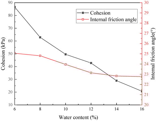 The result of the moisture percentage change on the cohesiveness and angle of internal friction of unsaturated clayey sand is shown in Figure 4. It appears that with the rise in the amount of moisture, the cohesion of clayey sandy soils shows a decreasing trend. Among them, the cohesion of 16% moisture content clayey sand decreased by 76.2% compared with that of 6% moisture content. For unsaturated clayey sand, the cohesion came from the soil’s water’s capillary movement [] and the cementation body formed between clay particles and water []. When the amount of moisture rose, the matrix suction of soil became smaller and the water’s lubricating properties reduced the soil particles’ interaction with one another, both of which reduced the cohesion [].