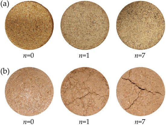 Pictures of soil samples with varying numbers of cycles (n). (a) sandy clay soil; (b) clay soil that is powdery.