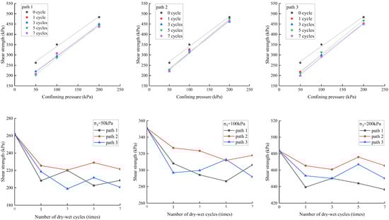 According to Figure 7, compared with the soil samples without wet–dry cycling, the soil’s shear strength following the wet–dry cycling of paths 1, 2, and 3 decreased by 7~22.7%, 1.6~15.8%, and 3.5~24.1%, respectively. Among them, the decrease in shear strength of soil samples under path 2 is the lowest, while the decrease in shear strength under paths 1 and 3 is close. While paths 1 and 3 have similar magnitudes of intensity decay, paths 1 and 3 have the same upper limit moisture content, different cyclic amplitudes, and similar strength attenuation. Path 2 has a small cycling amplitude and a lower upper and lower cycling limit for water content, with the smallest shear strength decay. Therefore, comparing the different cycling paths, it can be seen that a larger upper limit water content and cycling amplitude both lead to a higher degree of strength deterioration.