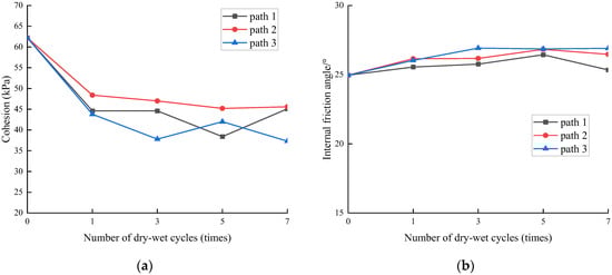 The impact of wet–dry cycles concerning the cohesion and angle of internal friction. (a) Cohesion; (b) Angle of internal friction.