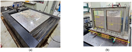 Test apparatus: (a) shaking table devices; (b) soil box and absorbing sponges.