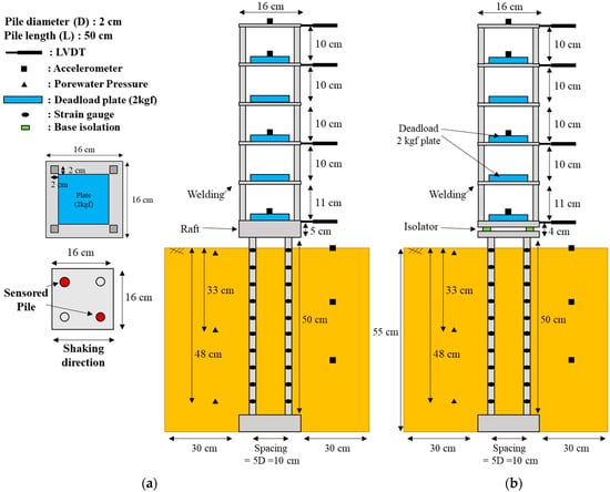 Figure 3 shows the sectional view of model tests with base isolation. Piles and buildings used in the base isolation model are identical to the non-base-isolation model in this test.. The total height of the base plate, base isolation, and first floor is 4 cm, which is 1 cm smaller than the 5 cm raft of a non-base-isolated structure. The testing model piles and structures were uniformly modeled with a scale factor of 25 according to Iai []. The prototype pile is a PHC pile with a diameter of 0.5 m, thickness of 0.08 m, and length of 0.5 m. Table 2 presents the specifications of the model piles used in this experiment. The model piles were made of aluminum (6061-T6). The pile length was selected as 0.5 m to satisfy the long pile condition based on Broms []. The model group piles consisted of four piles placed in a 2 × 2 configuration with spacing as 5 times the pile diameter (D). In addition, piles were inserted into the bottom plate of the soil box at a depth of around 1 D to simulate end-bearing pile conditions. To measure the strain of the pile along the depths, strain gauges were attached to the surface along the pile lengths.