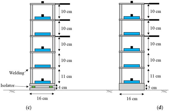 Schematic views of test models: (a) without base isolator in SSI; (b) with base isolator in SSI; (c) with base isolator in rigid base; (d) fixed base in rigid base.