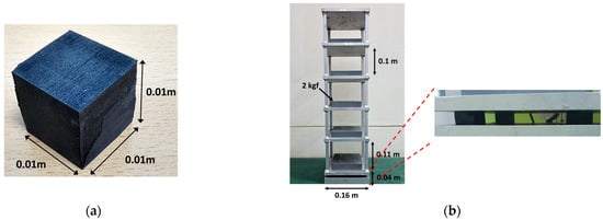 A raft, pillars, and slabs in the building structures were made of aluminum. It was designed for the case of group piles not directly attached to the ground surface. The superstructure was designed as a six-story building model, consisting of column structures with the same dimensions as the raft (0.16 m × 0.16 m). The height of each column was 0.11 m for the first floor and 0.10 m for the remaining floors, with a slab height of 0.02 m for each floor. Then, 1.9 kg of mass plates were attached to all floors except the roof to simulate dead loads. The raft under the buildings was determined to have dimensions of 0.16 m in width, 0.16 m in length, and 0.05 m in height.