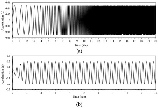 Typical input accelerations: (a) sweep tests (0.05 g); (b) sinusoidal wave (0.2 g).