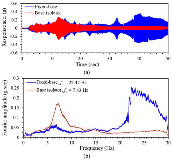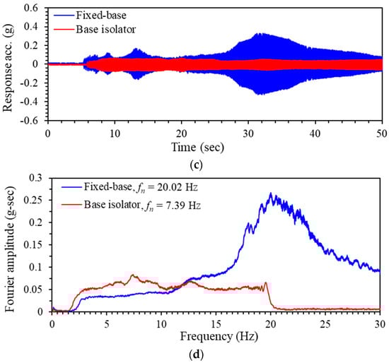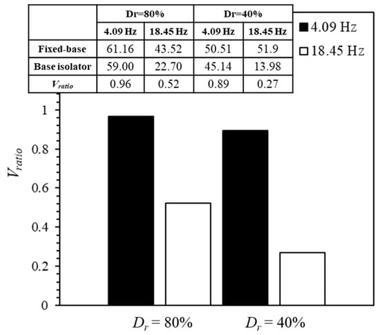 where is the base shear force of a base-isolated structure, and is the base shear force of a fixed-base structure. For relatively low-frequency earthquakes at 4.09 Hz, the base shear force decreased; however, it was less effective compared to earthquakes at 18.45 Hz (Figure 13).