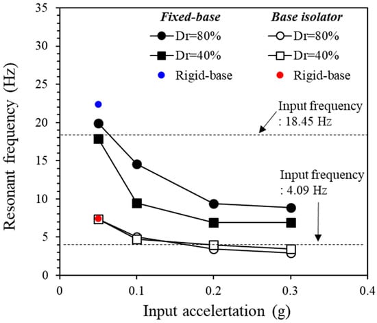 Figure 7 shows the variation of the resonant frequencies of structures with varying input accelerations. The base isolator effectively reduced the resonant frequency of the structures regardless of foundation conditions. The case without base isolation showed a clear difference in resonant frequency depending on the relative density of the soil, but the case with base isolation showed it rarely. It was shown that the reduced resonant frequencies of pile-supported buildings with base isolation were closer to the input frequency of 4.09 Hz than cases without base isolation.