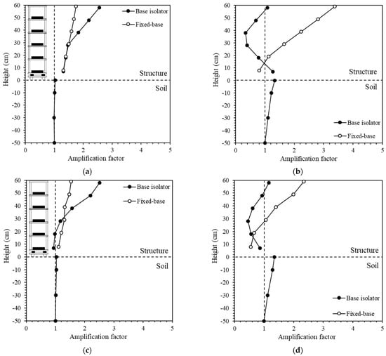 Amplification factors of pile-supported structures: (a) Dr = 40%, 4.09 Hz; (b) Dr = 40%, 18.45 Hz; (c) Dr = 80%, 4.09 Hz; (d) Dr = 80%, 18.45 Hz.
