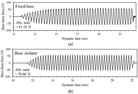 Typical results of base shear force (Dr = 80%, 4.09 Hz): (a) fixed-base structure; (b) base-isolated structure.