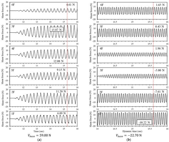 Figure 12 shows the base shear forces under different input frequencies. It was shown that when high-frequency earthquakes occur in the base-isolated structure, the phase of the response acceleration at each story is different, resulting in opposite signs of the inertial forces generated at each story. Consequently, the base shear force of the structure effectively decreased compared to that of the fixed-base structure (Figure 12). Moreover, it is noteworthy to observe the variation in the trend of shear forces at each story due to the presence of the base isolator, as depicted in Figure 12. In Figure 12a, the largest difference in shear forces between stories is observed on floors 5 and 6, while in Figure 12b, the greatest difference occurs between floors 3 and 4. Since the shear forces generated at each story must be borne by the columns of the superstructure, careful attention is accordingly required in the design. This is estimated to be due to the influence of the base isolator increasing the natural frequencies of the structures. Additionally, to compare the reduction rate of the bottom shear force, the ratio of the bottom shear force (Vratio) for each support condition was analyzed using Equation (3).