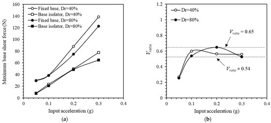 Figure 14 presents graphs analyzing the base shear forces of pile-supported structures obtained through sweep tests with various input accelerations. Across all input acceleration cases, the fixed base exhibited higher base shear forces compared to the base isolator. Additionally, at the same input acceleration level, the base shear force was higher at a relative density of 40% compared to 80% (Figure 14a). These differences between the results in Figure 14 and those in Figure 13 can be attributed to the effects of resonance behavior. It was shown that the base shear force of the pile-supported structure system tends to decrease as the relative density of the soil increases under resonance. In the case of a sinusoidal wave test with a specific frequency, if resonance does not occur with the resonant frequency of the soil–structure system, it denotes that the behavior of the soil–structure system may appear differently depending on the ground conditions. Figure 14b presents the base shear force ratio of sweep tests with varying input accelerations. The base shear force ratio (Vratio) showed a trend independent of the relative density of soil. Except for the case of an input acceleration of 0.05 g, a reduction in base shear force was recorded between 0.54 and 0.65 during resonance. For the input acceleration of 0.05 g, the base isolator exhibited significantly smaller response amplification contrasted to the fixed-base condition for most response accelerations.