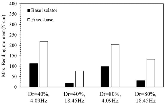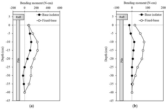 Figure 18 shows the analysis results on the maximum pile-bending moments according to the presence of base isolation. In all cases, it was found that the pile-bending moment was reduced compared to those without base-isolated systems. It was especially shown that the bending moments of pile under the high-frequency acceleration recorded a significant reduction in the fixed-base condition.