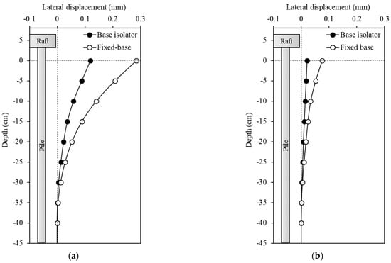 Figure 19 summarizes the horizontal behavior of the pile-supported structure, extending from the superstructure to the pile foundation. The horizontal displacement of the pile structure was found to be significantly smaller compared to that of the superstructure. An important point to note is that while the horizontal displacement of the superstructure varied depending on the frequency of the input acceleration and the support conditions, the pile foundation of the base-isolated structure exhibited less horizontal displacement compared to the fixed-base structure. This trend aligns with the analysis of the reduction in bottom shear forces discussed in Section 3.3. In other words, base isolators seem to be able to reduce the structural resistance of the pile foundation, which could contribute to more economical seismic designs.