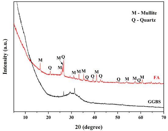 The results of the XRD analysis of the in situ binders (FA and GGBS) is shown in Figure 8. The main diffractograms of FA revealed quartz (Q) and mullite (M). A broad feature, often referred to as an ‘amorphous hump’, was observed between 20 and 35° (2θ), and it was associated with the glassy component present in the FA [56]. The diffraction patterns of the raw GGBS showed small detectable quantities of crystalline calcite and gypsum, alongside a predominantly amorphous material. The crystalline phase of trisodium phosphonoformate hexahydrate was detected in the raw HEDP·4Na material.