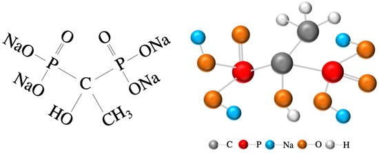 Green and low-cost HEDP·4Na solid powder served as an admixture in this study. The chemical structure of HEDP·4Na is depicted in Figure 3. Before mixing with other materials, the solid HEDP·4Na powder was dissolved in de-ionized water to ensure uniform distribution throughout the fresh paste. This process effectively enhances the properties of the alkaline activator liquid (AAL), aiming to meet standard performance criteria, including workability, setting time, and compressive strength, as outlined in the BSI Standards [41,42,43].
