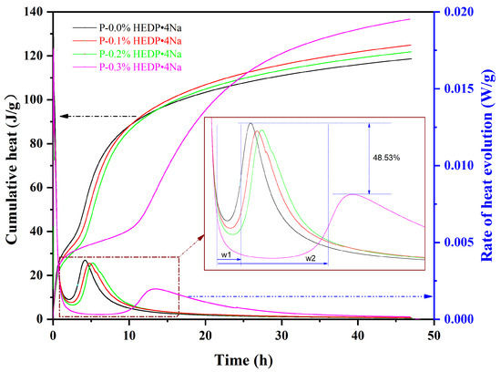 Due to the chelation of the HEDP·4Na molecule with two phosphate groups and the calcium cation from the solution, the rate of dissolution of solid particles in the solution was prolonged, as evidenced by the extension of the induction period in Figure 4. As a result, the rate of the hydration reaction was decelerated, leading to an increase in both the workability and setting time for the AAFS paste containing HEDP·4Na.