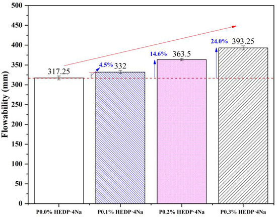 • In contrast to the AAFS mixture without HEDP·4Na, the flowability of the AAFS mixture containing 0.1%, 0.2%, and 0.3% of HEDP·4Na showed increments of 5%, 15%, and 24%, respectively. Similarly, the initial setting time was prolonged by 5%, 19%, and 37%, respectively. The final setting time was also delayed by 8%, 23%, and 50%, respectively. This observation potentially demonstrates the favorable influence of HEDP·4Na on the rheological characteristics of the AAFS fresh mixture.